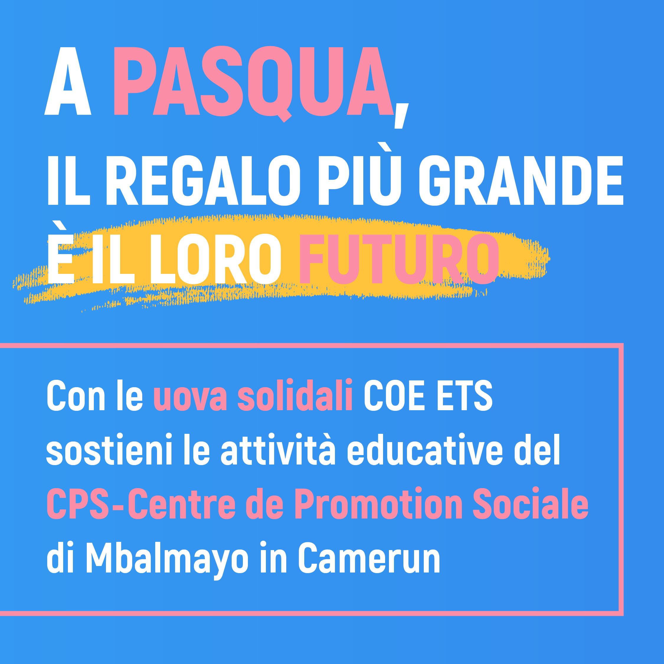 Con le uova solidali COE ETS sostieni le attività educative del CPS – Centre de Promotion Sociale di Mbalmayo in Camerun che include il College Technique “Nina Gianetti”, creato nel 1977, l’Istituto di Formazione Artistica – IFA, creato nel 1990, la scuola materna ed Elementare “L’Espoir”, creata nel 1982.