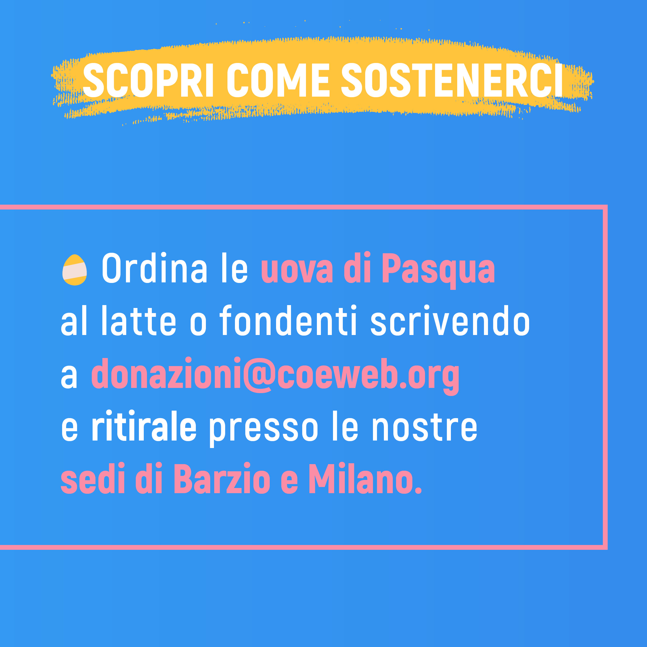 Ordina le uova di Pasqua al latte o fondenti scrivendo a donazioni@coeweb.org e ritirale presso le nostre sedi di Barzio e Milano.